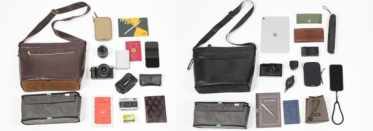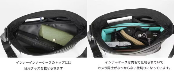 バッグ自体はカジュアルな見た目を保ちながら、内部には着脱可能な専用インナーケースを内蔵。底板とクッションで守られた下部にはカメラ機材、上部には日常品を収納できる上下二層構造。カメラを持ち運ばない日は、インナーケースを取り外して通常の軽量バッグとしてもご使用いただけます。